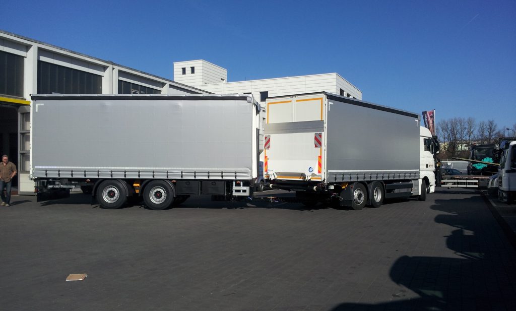 Geteilte Züge mit Drehschemelanhänger oder Zentralachsanhänger in den verschiedensten Gewichtsklassen, verschiedenste Kuppelvarianten, tiefe Kurzkupplung, ausziehbare Kuppelsysteme für Durchladung, Durchladezüge, mit allen Aufbauvarianten kombinierbar, Volumenzüge, Mitnahmestapler, individuelle Zusatzausstattungen.