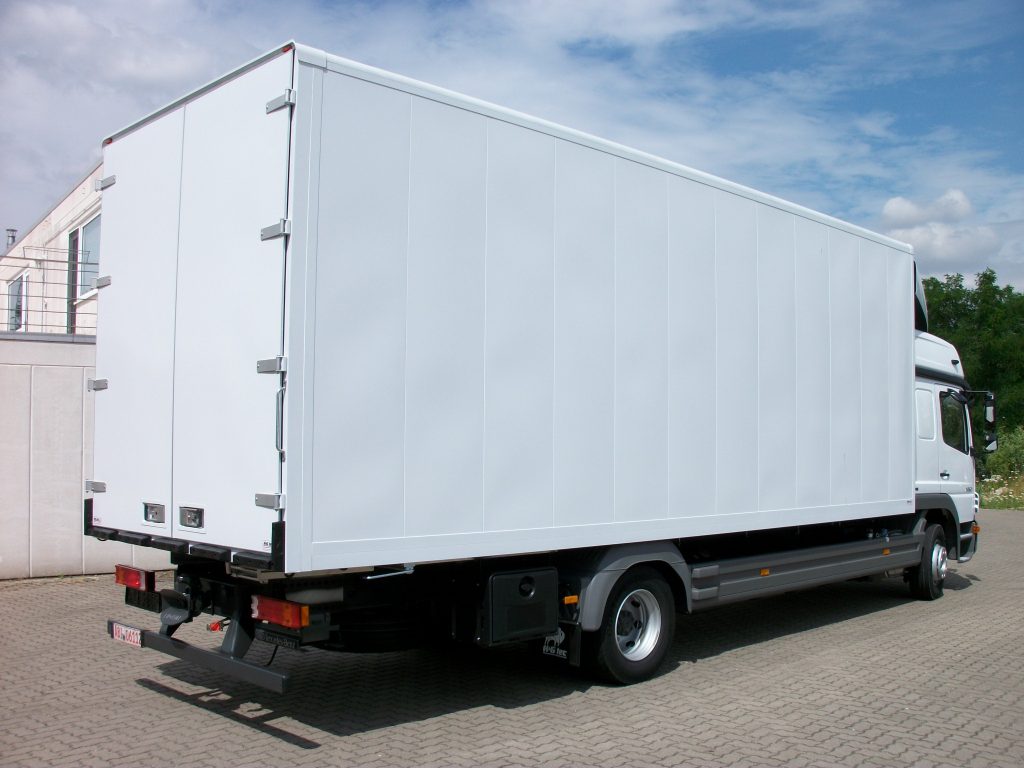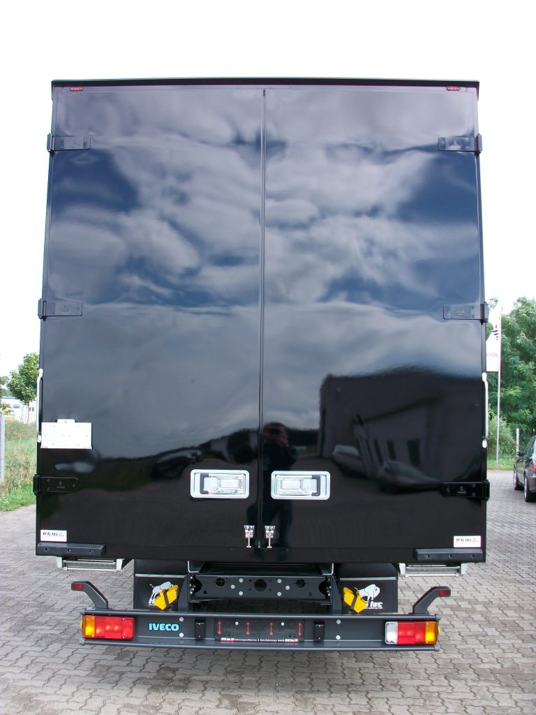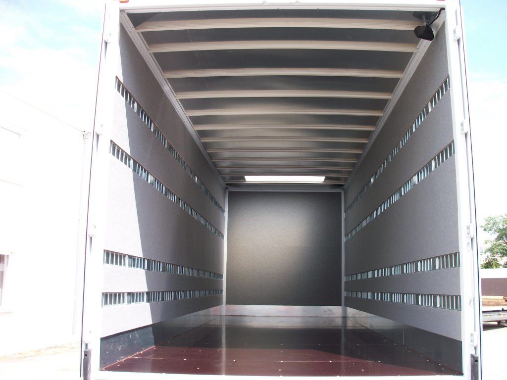 Möbelkofferaufbauten mit eingelassenen Stäbchenzurrschienen oder eingelassenen Kombi-Binde-Schienen, glatter einteiliger Boden ohne Stöße, Nadelfilzauskleidung, Ausziehtreppe, Seitentüren, individuelle Zusatzausstattungen möglich.