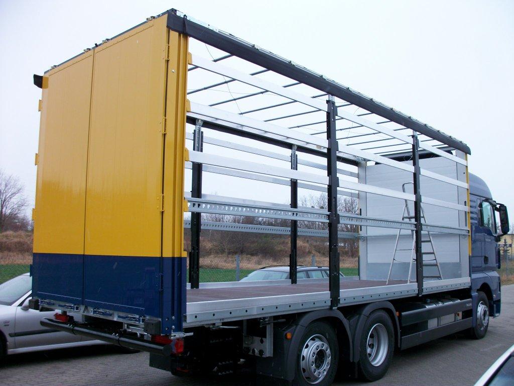 Ladungssicherungszertifiziert nach VDI 2700 bzw. Code XL, auf Wunsch mit Bordwänden, Hubdach, Schiebeverdeck, Zurrbügelaußenrahmen, Lochaußenrahmen, Palettenanschlag, Volumenausführung mit Mega-Dachrahmenprofil, individuelle Zusatzausstattung möglich.
